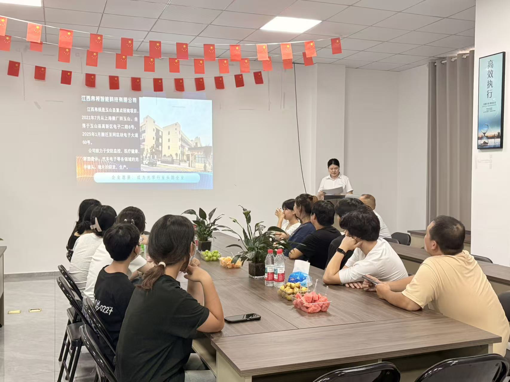 Företagets resa – från flytten från Shanghai till Yushan till dess nuvarande fokuserade framsteg inom det optiska området – delades, vilket lyfte fram Silks fortsatta engagemang för forskning och utveckling av hårdvara och innovation inom sektorer inklusive säkerhetsövervakning, medicinsk hälsa och fordonselektronik. Sloganen "Efficient Execution" som visas på väggen återspeglar på ett träffande sätt lagets operativa anda. Denna sammankomst fungerade inte bara som en introduktion till företagskulturen utan också som en tydlig kommunikation av företagets vision: att bli det mest värdefulla företaget i den optiska industrin.